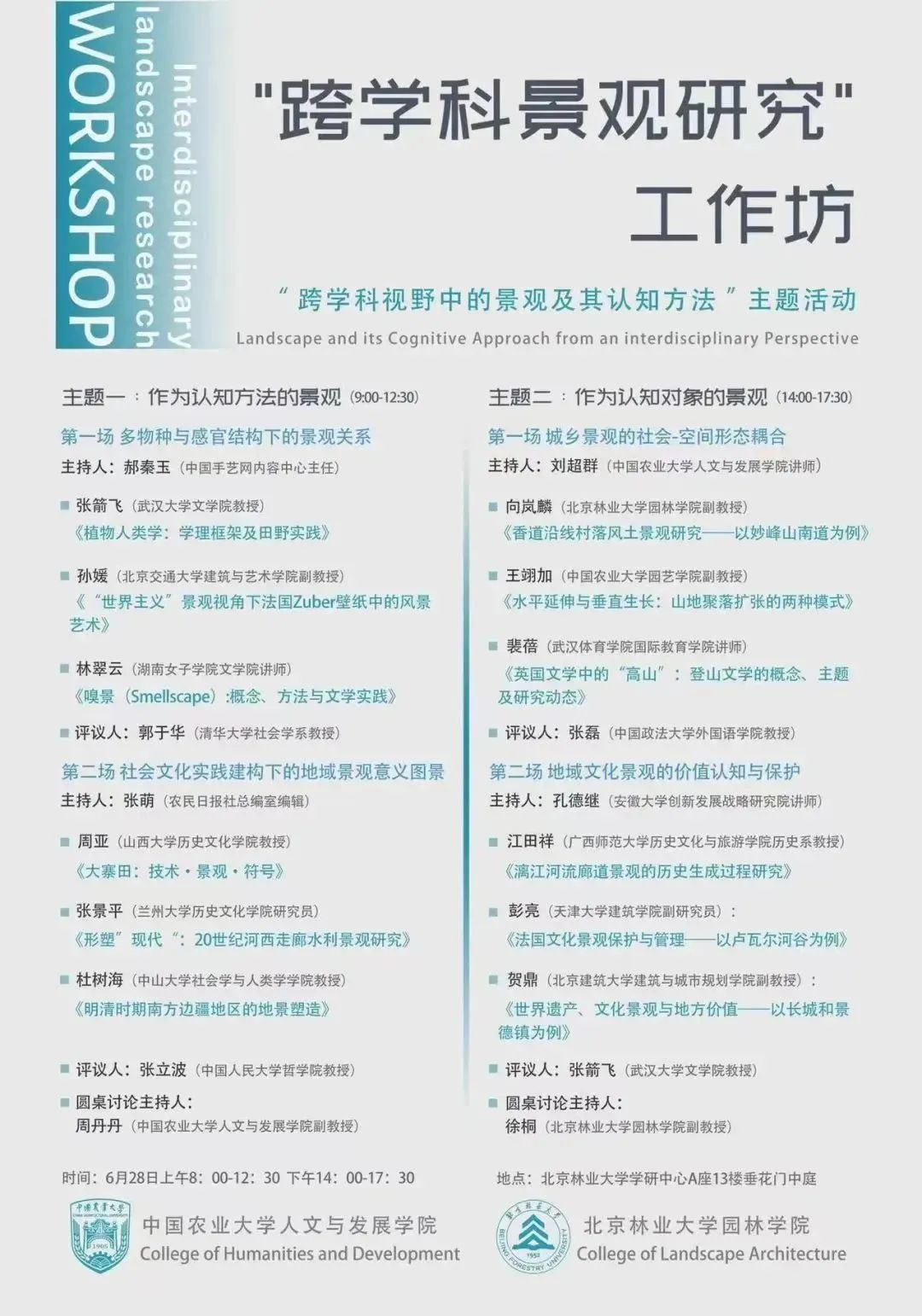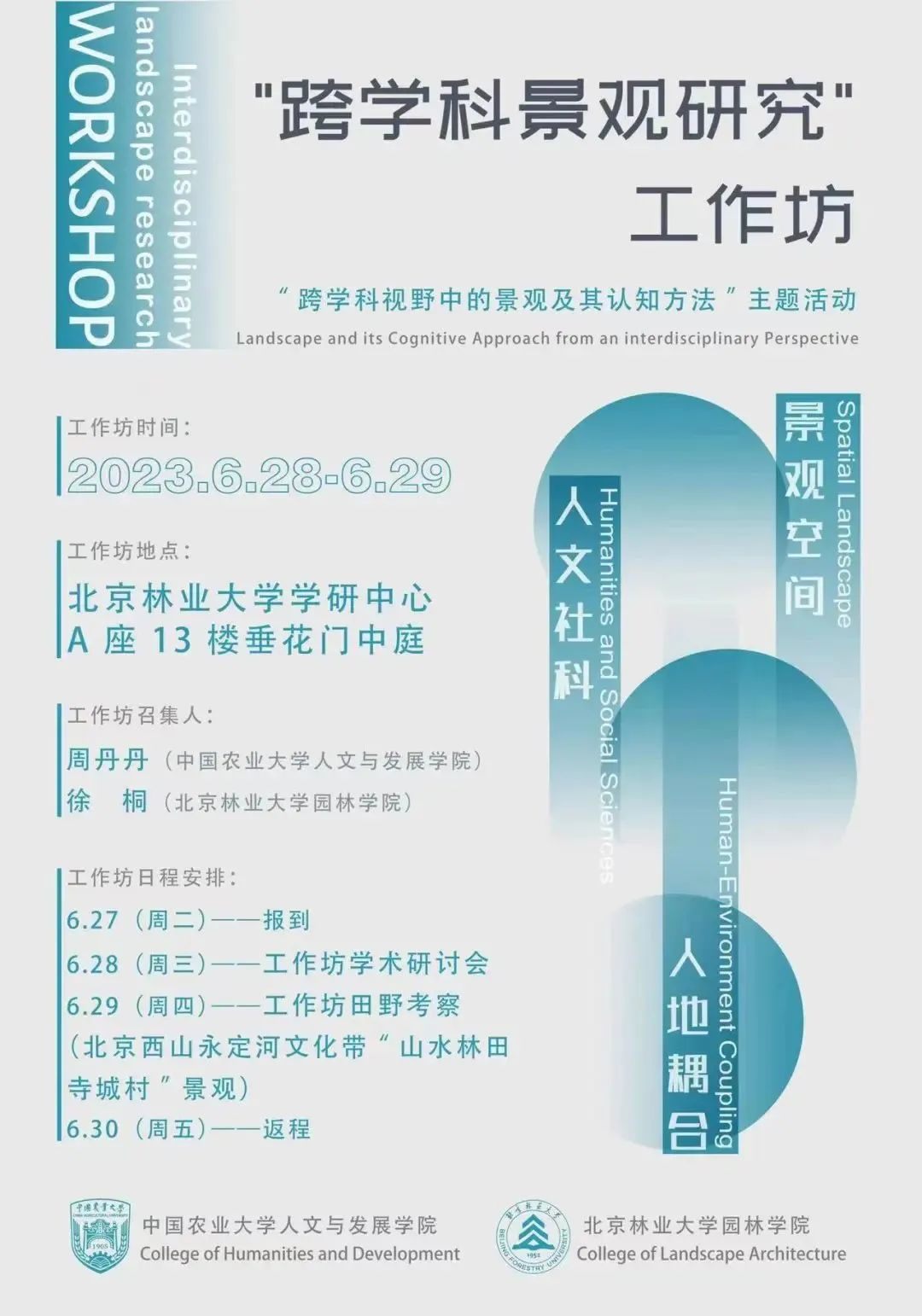 由中国农业大学人文与发展学院、北京林业大学园林学院联合主办的“跨学科景观研究”工作坊将于2023年6月28日-29日在北京举办。其中,28日(星期三)将在北京林业大学学研中心大厦A座13层垂花门中庭举办工作坊学术研讨会,29日(星期四)参会者将赴北京“西山永定河文化带”考察山水林田寺城村景观。