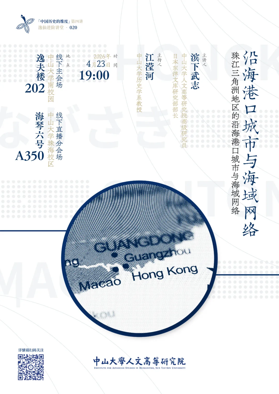 逸仙进阶讲堂系列课程“中国历史的维度:空间、思想与社会结构”邀请中山大学人文高等研究院驻访学者及领域内权威学者分别讲授各相关分支专题。课程第四讲“沿海港口城市与海域网络:珠江三角洲地区的沿海港口城市与海域网络”将由中山大学人文高等研究院高级研究员滨下武志主讲。诚邀各位师友相聚学术盛宴!